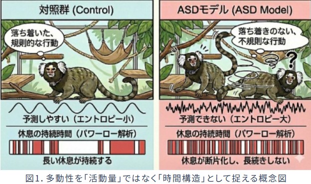 本研究では、自閉スペクトラム症(ASD)モデルマーモセットを用い、多動性を単なる「活動量」ではなく、活動の不規則性や時間構造、休息の持続性といった観点から精密に解析しました。